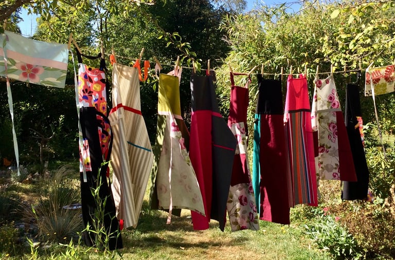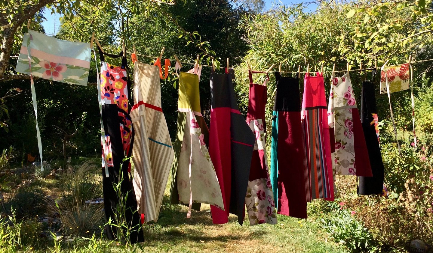 Ouverts devant inspirés des tabliers de potiers, japonais aux bretelles croisées au dos, réversibles pour changer parce chaque jour est différent, tabliers robes ou année 50 pour une élégance très féminine, mini tabliers multipoches si pratiques pour ranger et avoir sous la main tout ce qui vous est utile, ces modèles sont de véritables vêtements de travail ou de loisir.