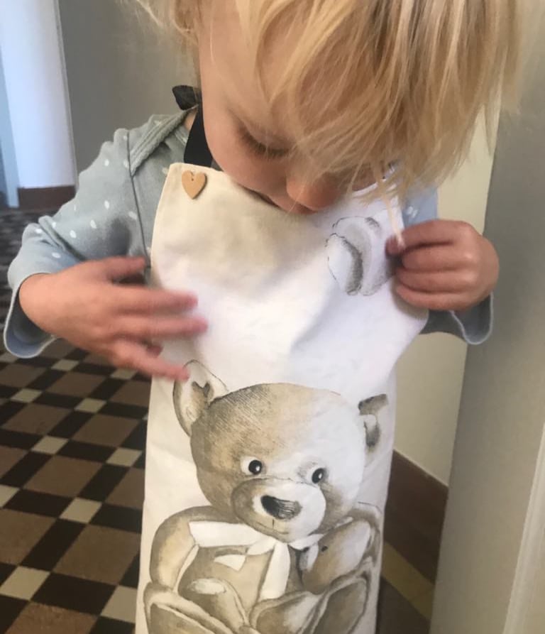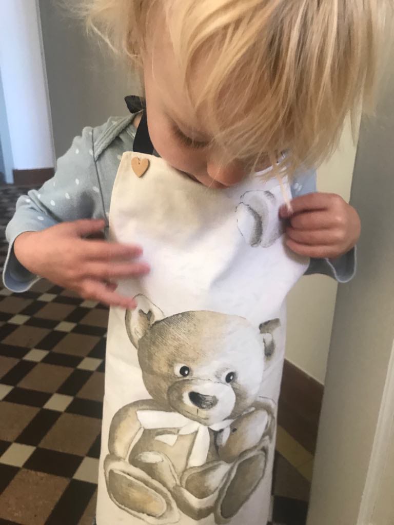 Un tablier à emporter chez Papy et Mamy, chez la nounou, chez les copines-copains, en vacances.